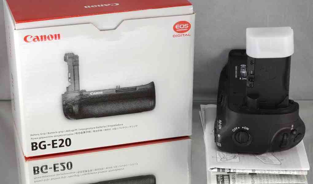 Součástí aukce je: grip Canon BG-E20, Držák na LP-E6 v originál krabici.
