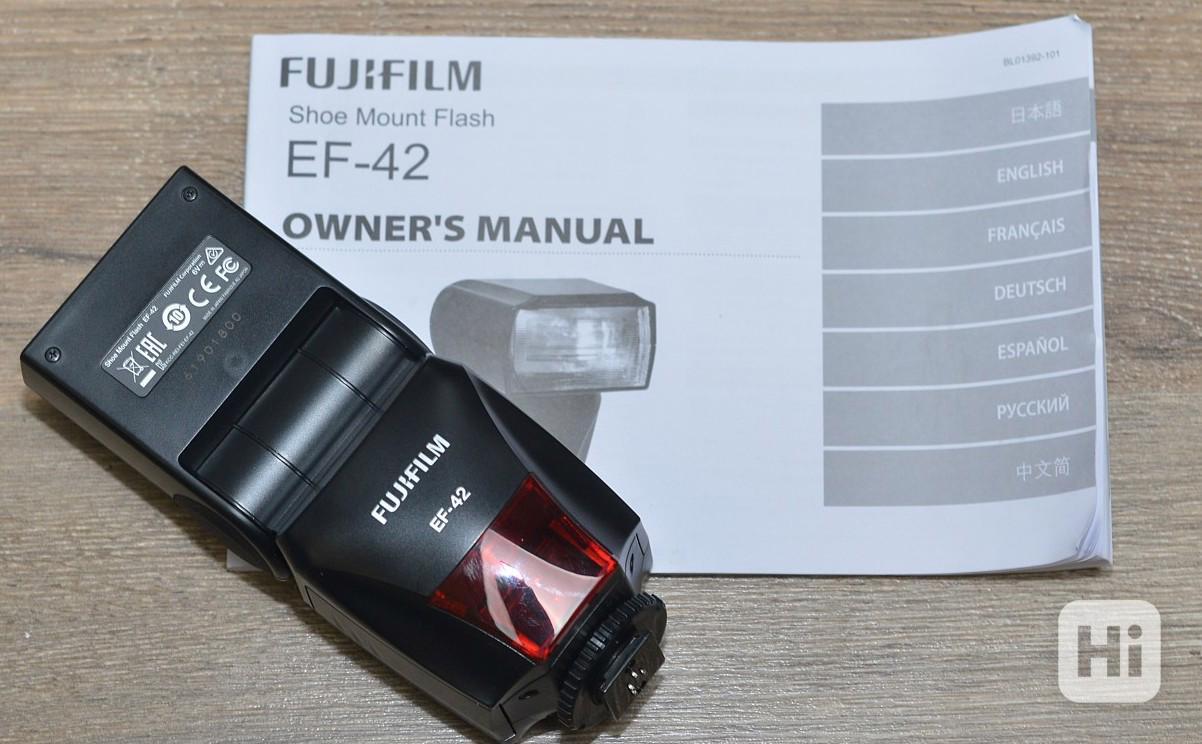 Systémový blesk určený pro fotoaparáty značky Fujifilm. Výkonný přídavný blesk Fujifilm EF-42 je vybaven velkým stavovým displejem i AF diodou a dokáže komunikovat s fotoaparátem prostřednictvím TTL protokolu* (bere tedy v potaz jak vzdálenost zaostření, tak pracovní clonu, citlivost ISO i expoziční čas) či prostřednictvím manuálního nastavení. Pohyb hlavy blesku je možný v rozmezí 0, 45, 60, 75 a 90° vertikálně a horizontálně až o 180° vlevo a 120° vpravo.