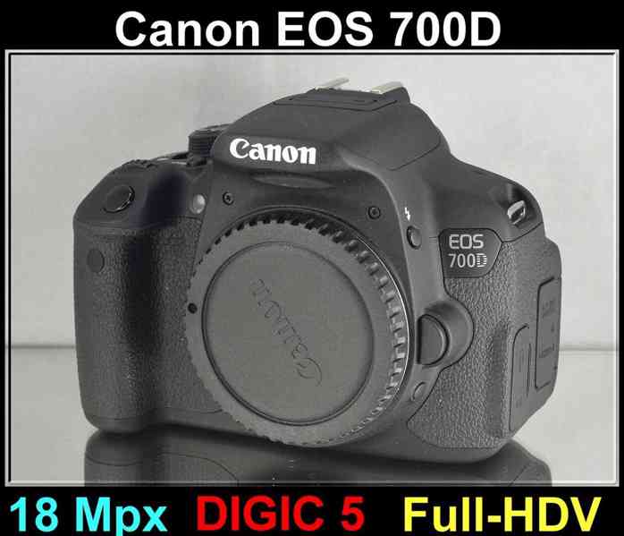 Canon EOS 700D je digitální zrcadlovka, která vychází z modelu 650D. 18 Mpx snímač CMOS se vyznačuje vynikajícími vlastnostmi při fotografování při nedostatečném osvětlení a vytváří snímky s nízkou hladinou šumu. Inovovaný procesor DIGIC 5 přináší výkonné zpracování obrazu, zaručuje tak plynulé přechody a přirozeně vypadající barvy. Dále mezi jeho vlastnosti patří natáčení videozáznamu ve Full-HD kvalitě s možností ručního nastavení a průběžného AF zaostřování, devítibodový systém automatického zaostřování, dotykový 3,0" LCD displej s variabilním úhlem natočení a s rozlišením 1 040K bodů a 63 zónové iFCL měření. Vlastní sadu sedmi kreativních filrů.